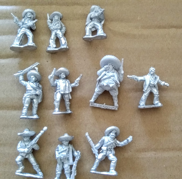 I was lucky in my selection from Black Scorpion too. The Fat Mexican bandit chief is clearly a leader and so being slightly larger works. The Apache are a faction, and thus need not match the other figures, and my female gunfighter is a solo type figure that doesn't really fit into any other faction.